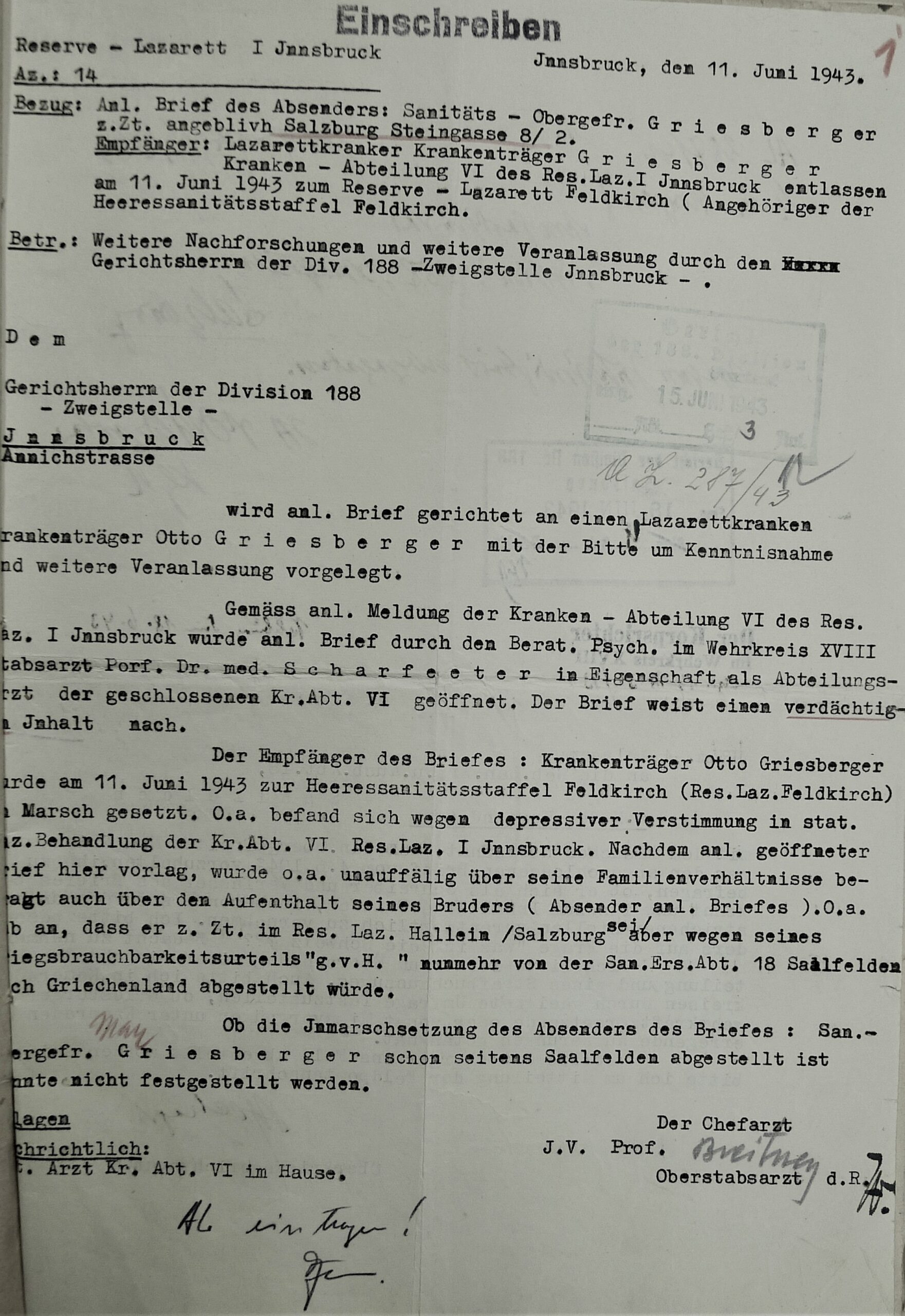 In 1943 the 38-year-old Otto GRIESBERGER was called up for service in the German army and was deemed fit for the front as a stretcher bearer. However, he was not sent to the front, but to a psychiatric clinic in Innsbruck, where he committed suicide on July 1, 1943, driven to his death at the age of 38.
